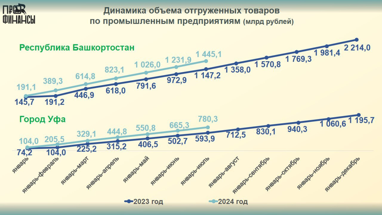 По данным Башкортостанстата, объем отгруженных товаров собственного промышленного производства за первые семь месяцев 2023 года составил по республике 1 445,1 миллиарда рублей, а по Уфе — 780,3 миллиарда рублей. Эти цифры указывают на значительный рост по сравнению с предыдущим годом, где объемы увеличились на 25,9% для республики и на 31,3% для столицы.