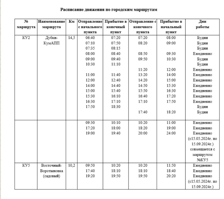 С 1 сентября 2023 года вступят в силу изменения в графике движения автобусных маршрутов № КУ2 и № КУ5. Эти изменения вызваны необходимостью оптимизации транспортного обслуживания на территории города.